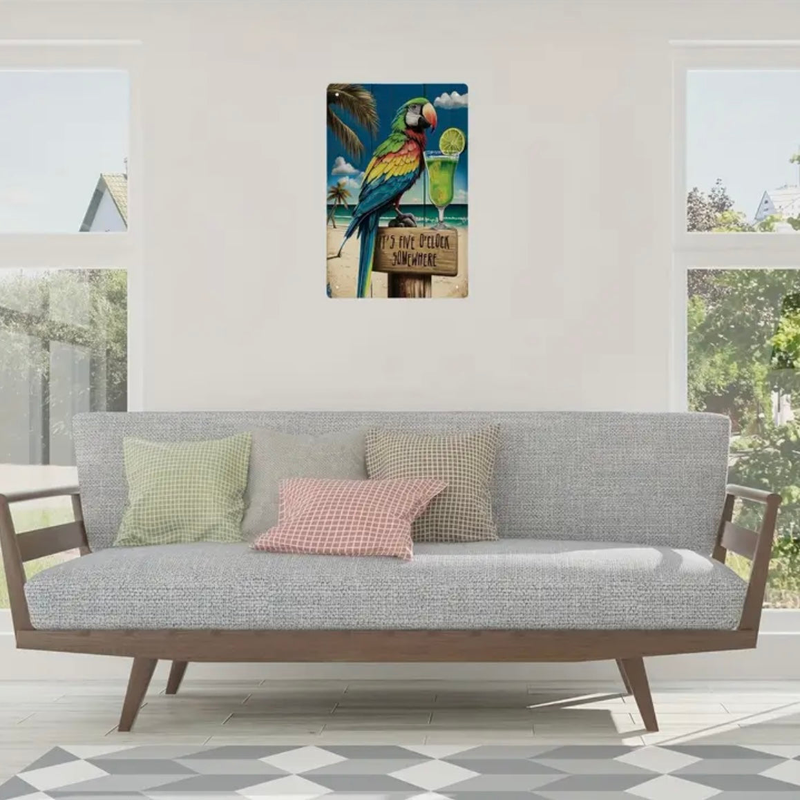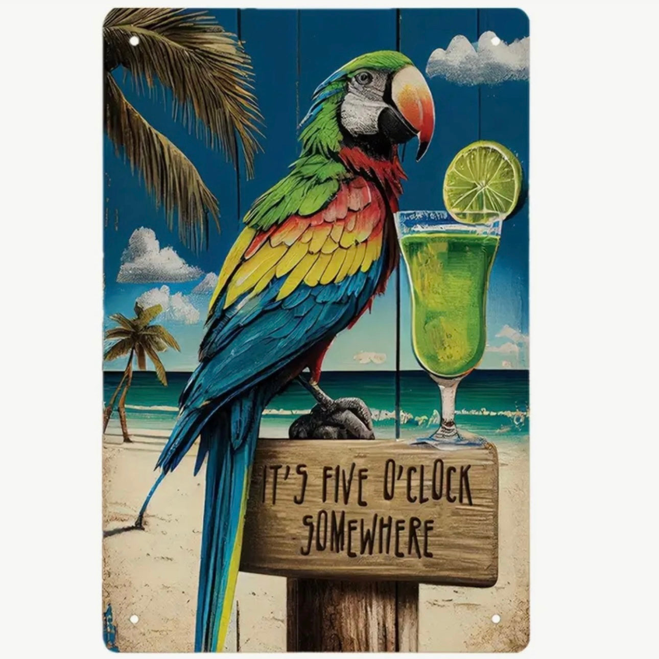 Placa de Alumínio com Papagaio e frase It’s five o’clock somewhere